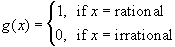 Left as Exercise. Show that g can not be continuous at a rational number by considering sequences of irrational numbers. Then show that g can not be continuous at an irrational number by considering sequences of rational numbers.