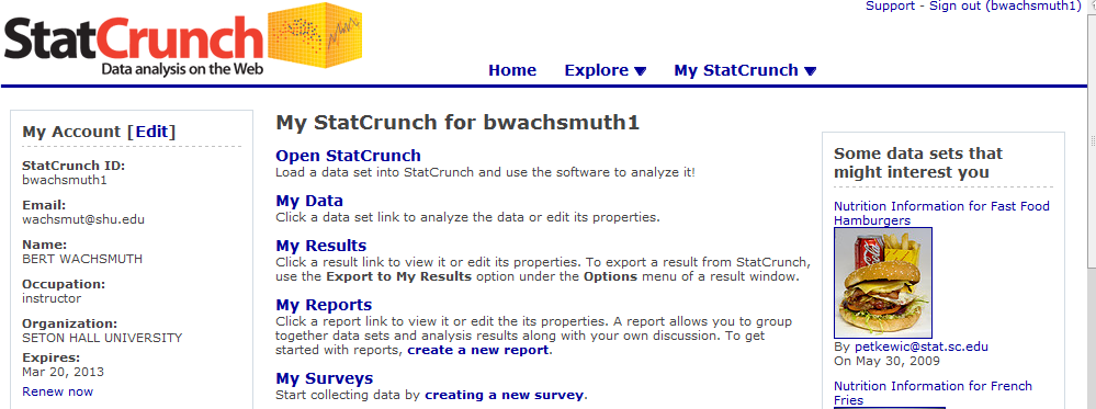 Three additional links on the main menu – click on My StatCrunch to access - are important: