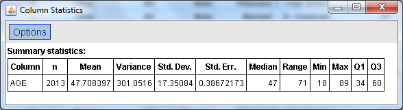 - You will see a table, containing the descriptors for your selected variable(s). In case you selected AGE you’ll see:
