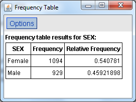 You will see that 1094 respondents were female and 929 were male. Out of a total of 1094 + 929 = 2023 that makes for a relative frequency of 0.54 or 54% for females and 0.46 or 46% for males. You could optionally copy your result to “My Results” for later use. Note that the GSS survey includes N = 2024 data sets so that one person chose not to answer the question about SEX. That person is considered “missing” and does not figure into the computation of the relative frequencies.