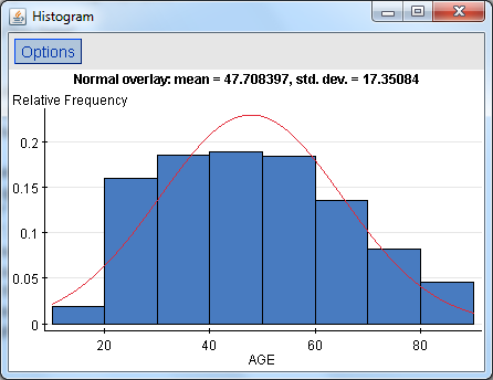 - Now you can overlay a standard distribution curve such as a normal curve to see if your variable can be approximated by that curve. Pick, in our case, “Normal” as your option and leave the rest alone. Click “Next”.