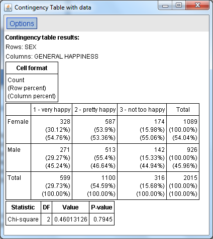 You will see, for example, that 30.1% of all females are very happy (row percent), while 44.94% of all “not too happy” people where male (column percent). Moreover, it seems like the overall happiness is not related to the sex of the respondents.