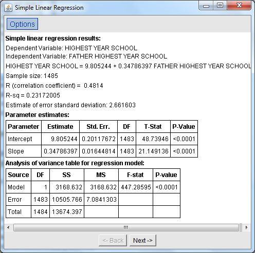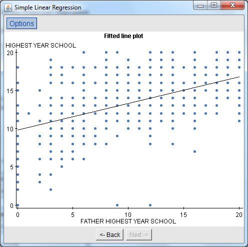 - Next specify the X and Y variables. Usually X is considered the independent variable, Y the dependent one. Note that only numeric variables are shown. Select, for example, FATHER HIGHEST YEAR SCHOOL as X variable and HIGHEST YEAR SCHOOL as Y to see if the number of years the father spent in school correlates linearly with the respondent’s years spent in school. Then click “Next”.